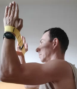 – Pentru acest exercițiu se folosește un elastic de antrenament sau o curea/centură (nu este obligatoriu să fie material elastic). Se fixează centura la nivelul antebrațelor, aproape de mâini.