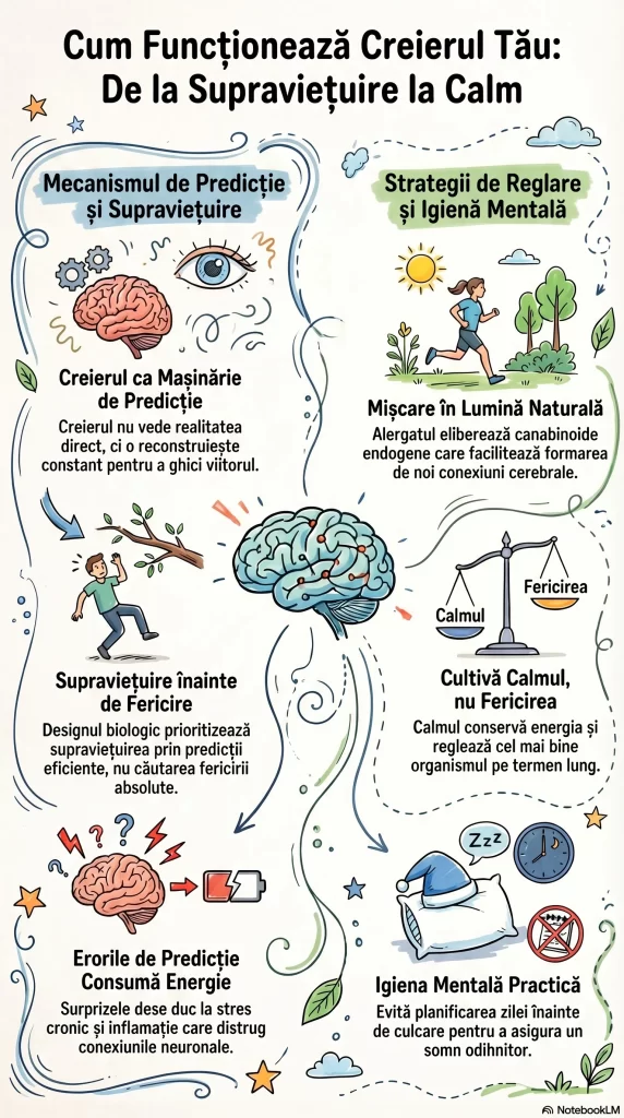 Ideea centrală este că creierul reconstruiește permanent realitatea pentru a prezice viitorul și a gestiona resursele corpului, iar sănătatea noastră mentală depinde de echilibrul dintre aceste predicții, reducerea inflamației cronice și menținerea unor obiceiuri zilnice care susțin biologia noastră socială și fizică.