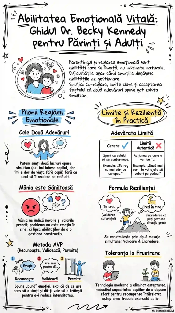 Sursa explorează viziunea psihologului Becky Kennedy despre educația emoțională, punând accent pe ideea că gestionarea sentimentelor este o abilitate ce trebuie învățată. Autoarea explică procesul de coreglare, prin care părinții își folosesc propriul calm pentru a ajuta copiii să treacă de la dereglare emoțională la echilibru interior. Un concept central prezentat este capacitatea de a accepta două adevăruri opuse simultan, metodă care facilitează stabilirea unor limite ferme fără a sacrifica empatia sau conexiunea. De asemenea, textul redefinește mânia ca pe o emoție sănătoasă ce semnalează nevoi neîmplinite, încurajând comunicarea directă în locul sugestiilor vagi. În final, sursele avertizează asupra impactului tehnologiei, care reduce toleranța la frustrare atât în cazul copiilor, cât și al adulților. Dr. Becky promovează o autoritate bazată pe reziliență, învățându-ne să validăm trăirile celorlalți fără a le compromite propria capacitate de a gestiona dificultățile.