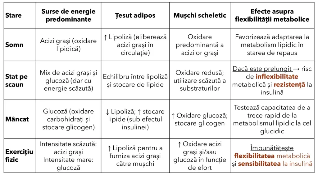 - Controlul caloric: Evită consumul excesiv de calorii pentru a preveni rezistența la insulină, o cauză majoră a flexibilității metabolice deficitare.