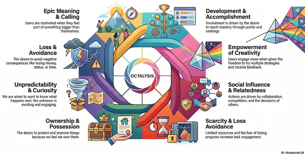 Cadrul Octalysis se bazează pe 8 Motoare Fundamentale (Core Drives) ale motivației umane, reprezentate într-o formă de octogon. Acestea sunt instrumente esențiale pentru a crea experiențe captivante.