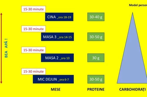 - Distribuiți uniform proteinele: Încercați să distribuiți aportul total de proteine în mod egal la micul dejun, prânz și cină. Aceasta ar trebui să asigure circa 0.4 g proteină/kg la fiecare masă principală pentru a stimula optim sinteza proteinelor musculare (MPS).