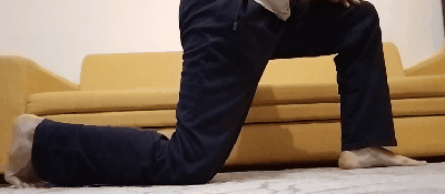 – Începe mișcarea cu împingerea lentă înspre înainte a genunchiul care este în fața ta. Menține poziția 2-3 secunde.