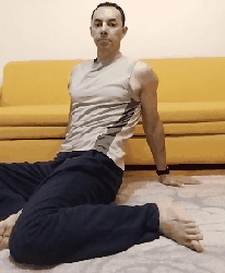 – Poziția de start: Așezat, palmele pe podea, genunchii flexați, iar coapsele pe podea, în partea stângă.