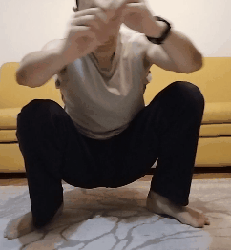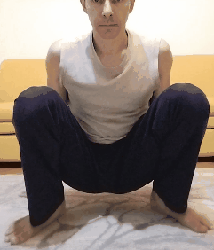 – Se execută o genuflexiune completă până jos în poziția șezând. Se duc lent picioarele înspre înainte, aducându-le, tot lent, înapoi lângă șezută. Încercați să vă ridicați în picioare fără ajutor. Dacă nu reușiți, încă, să faceți acest lucru vă puteți ajuta cu mâinile (cu sprijin înapoi) până când dezvoltați o mobilitate mai bună a articulațiilor gleznelor.