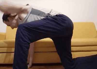 – Mișcarea constă în ridicarea coapselor de pe podea și trecerea genunchilor prin fața voastră până în partea cealaltă, așezând coapsele pe podea. Se revine la poziția inițială cu trecerea genunchilor prin fața voastră.